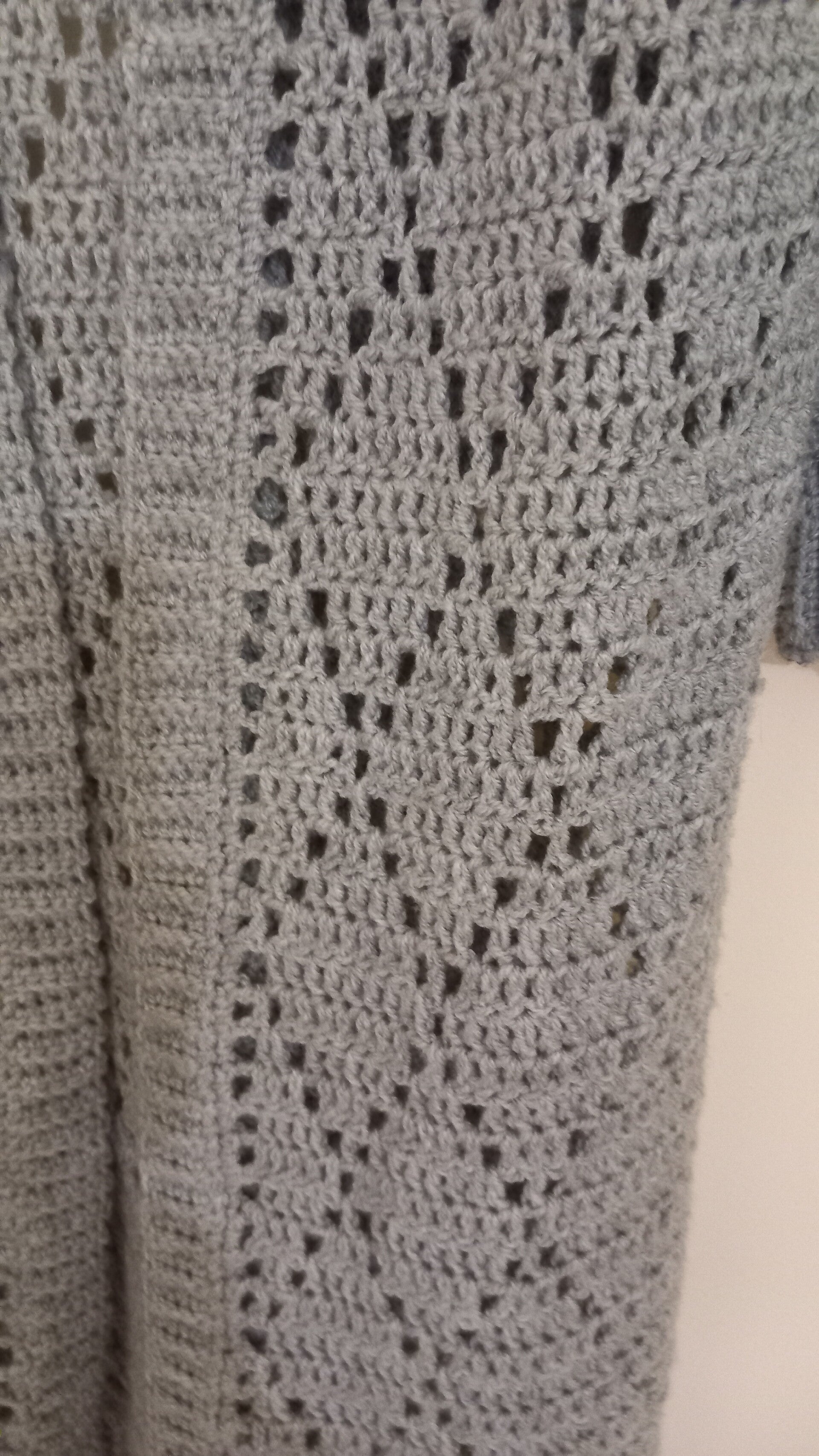 🩶 Long gilet ajouré au crochet – Élégance et douceur fait main